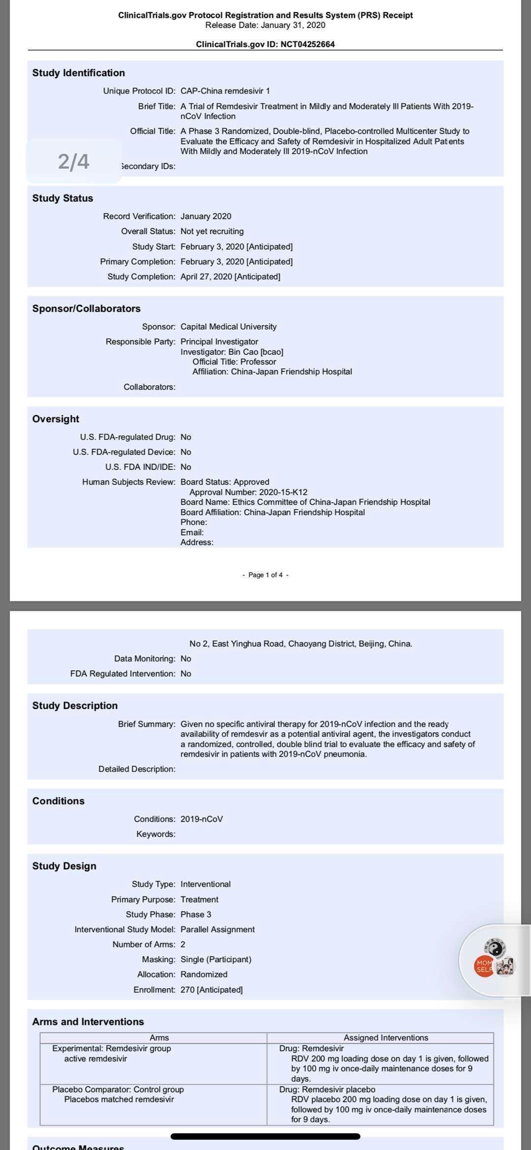 由中日友好医院曹彬教授牵头,试验预期于后天(2020年2月3日)开始,4月27日结束。