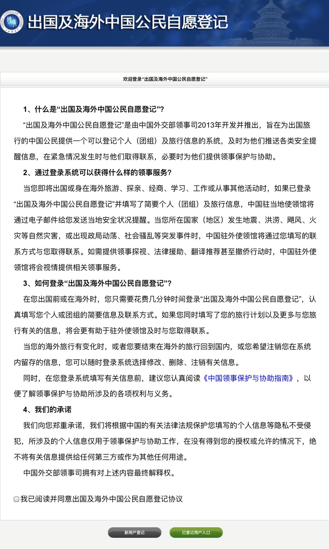首先认真阅读《中国领事保护与协助指南》,了解领事保护与协助所涉及的各项权利与义务。看完指南后,勾选“我已阅读并同意出国及海外中国公民自愿登记协助”,并选择“新用户登记”。