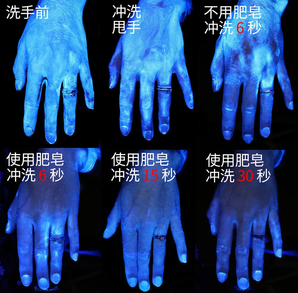 DailyMail 曾经报道过一个实验,完美呈现了不同搓洗时间的洗手效果。他们找来了一种能模拟细菌的产品 Glo Germ,涂满双手。Glo Germ 在紫外线照射下会发光,洗完手后拍照,越亮说明细菌越多手越脏,越黑就意味着细菌越少手越干净。